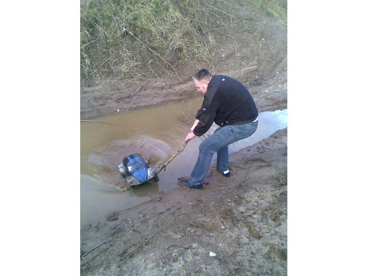 Vi var ude og køre idag, og jens kørte ud over et hophvad han ikke viste var at der var en mega dyb vandpytte på den anden side